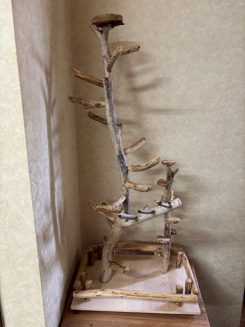 サイズは台座が45cm×19cm×厚み3cm。高さは1番高いところで50cm(台座の厚み含む)尖った釘やビスは使ってません。天然木でのハンドメイド品です。説明書はないので写真を参考に組立ててください。とはいえ、超簡単です。2.3カ所ネジを締めるだけです。自然の木を使っているのでシミやひび割れ、節等が少なからずあります。あくまでも素人の手作りですので神経質な方や完璧を求められている方はスルーして頂いたほうがよろしいかと思います。止まり木の交換に他のショップや市販での購入品を取り付けることもできます(網に取り付けタイプのみ)収納しやすく折りたたみ式にしております。16枚目の写真に載っているもの全ておつけします止まり木バードアスレチックバードジム多機能デザイン】この止まり木は、鳥が遊んだり休んだりするための多機能なデザインです。複数の枝があり、鳥が自由に動き回ることができます。【安全性と耐久性】木製の素材を使用しており、鳥にとって安全で耐久性があります。金属製のロック機構も備えており、安心して使用できます。写真のインコちゃんはイメージ画像ですご覧いただきありがとうございます。| カテゴリー: | ペット用品>>>鳥用品>>>止まり木 |